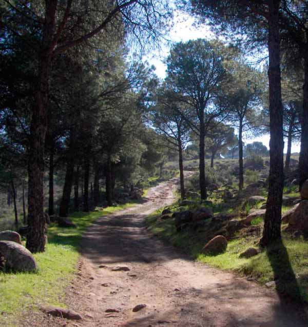 Dejando atrás las últimas casas, iniciamos un pequeño tramo descendente que nos aventura por un tupido bosque de pino alóctono que, a veces, alterna con eucalipto, recuerdo de la reforestación realizada durante la década de los cincuenta del siglo XX, añoranza de una bella ”postal franquista»que pretendía, aunque sólo fuera paisajísticamente, acercarnos a nuestros vecinos del norte de Europa. Cuando el camino de tierra viene casi a tocarla pista asfaltada, se nos ofrece un pequeño desvío (de ida y vuelta) que nos permite, a voluntad, acercarnos a conocer las ruinas de un viejo ”rajal de colmenas’í una especie de corral pétreo, rectangular y escalonado, que guarecía las colmenas de abejas. a sus inquilinos y producción, de posibles asaltos del ganado. En su interior, entre un bosque de jara y romero que lucha por dominar las pendientes, nos llama la atención la ordenada presencia de unos decrépitos almendros. Para no despistarnos, cuando acaba la vereda tomamos como referencia la torreta de una línea eléctrica, el rajal se encuentra avanzando en línea recta algo por debajo de la misma. Tras la visita, volvemos al arranque del desvío.